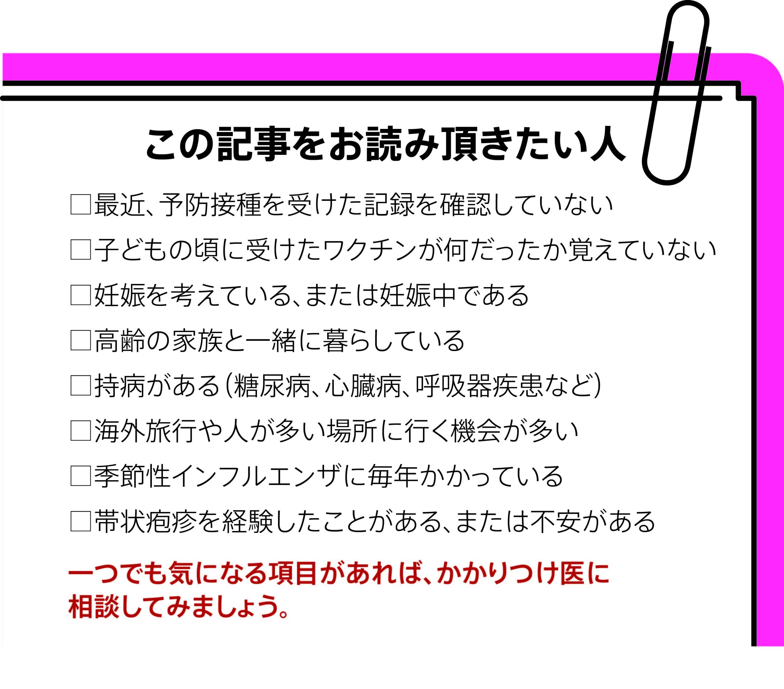 麻疹、風疹、インフルエンザ、HPV、帯状疱疹、肺炎球菌――私たちの暮らしのすぐそばに、予防できる病気はたくさんあります。